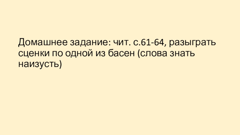 Слайд 6Домашнее задание: чит. с.61-64, разыграть сценки по одной из басен (слова