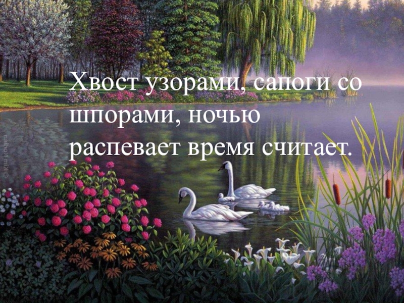 Слайд 22Хвост узорами, сапоги со шпорами, ночью распевает время считает.