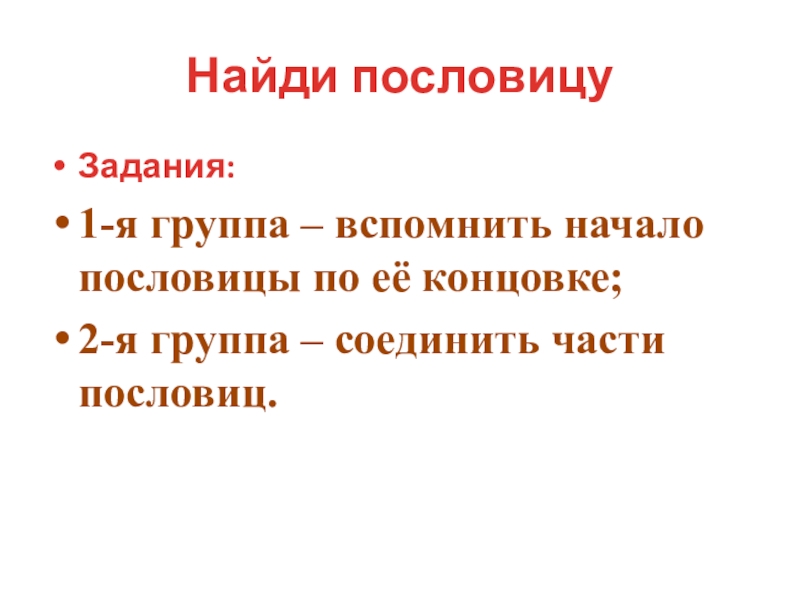 Найди пословицуЗадания:1-я группа – вспомнить начало пословицы по её концовке;2-я группа – соединить части пословиц.