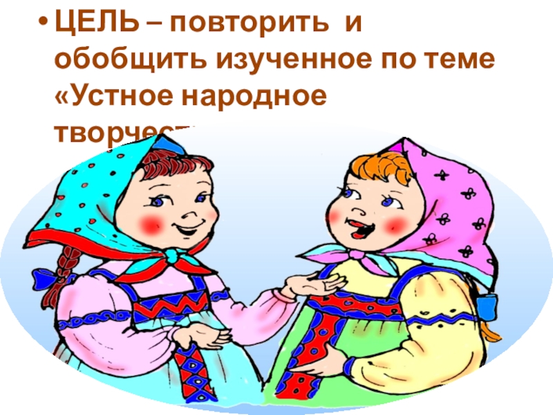 Слайд 3ЦЕЛЬ – повторить и обобщить изученное по теме «Устное народное творчество»
