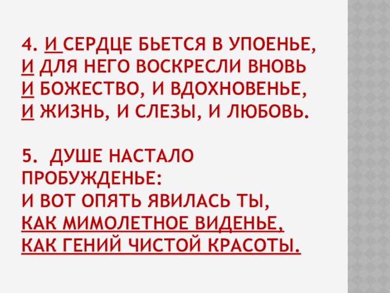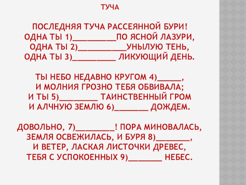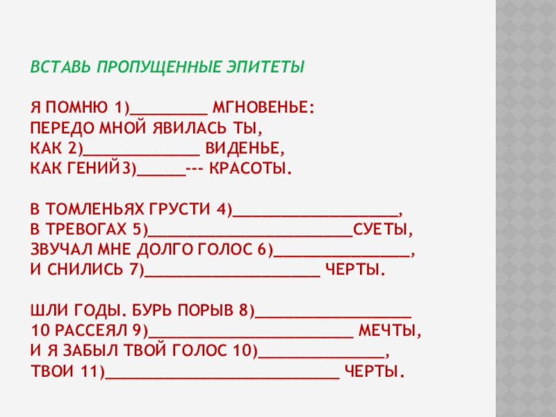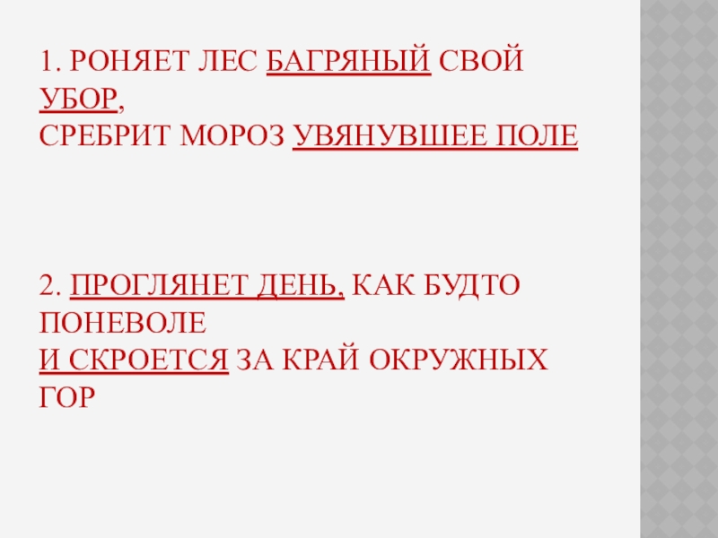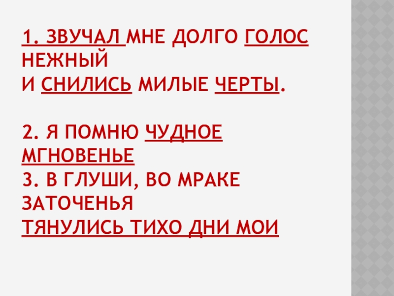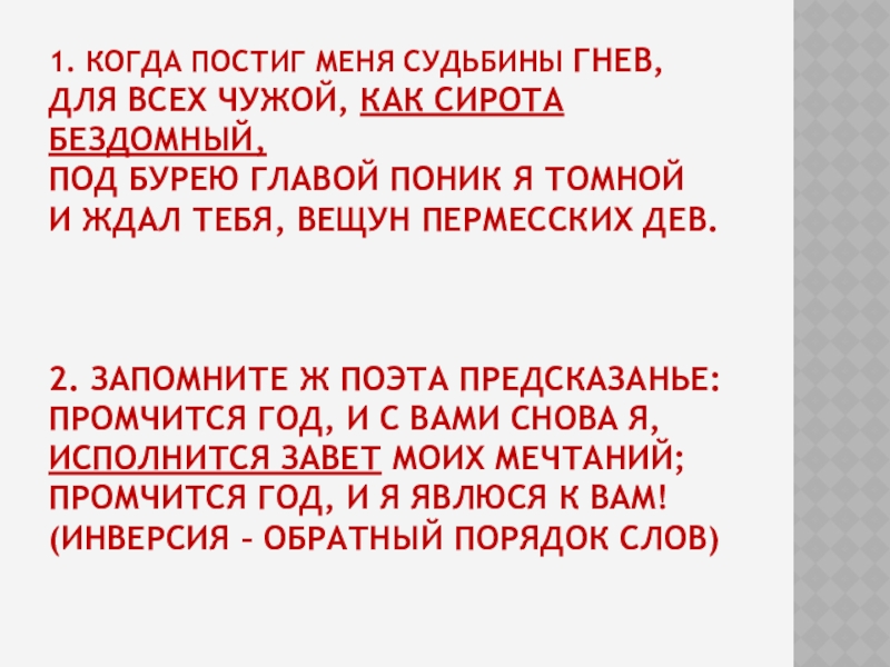 2. Запомните ж поэта предсказанье: Промчится год, и с вами снова я, Исполнится завет моих мечтаний; Промчится год, и я явлюся к вам! (инверсия – обратный порядок слов)
