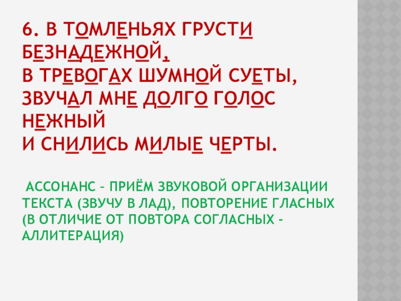 Ассонанс – приём звуковой организации текста (звучу в лад), повторение гласных (в отличие от повтора согласных - аллитерация)