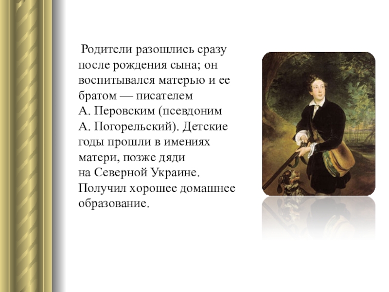 Мать — Анна Алексеевна Перовская — происходила из рода Разумовских (последний украинский гетман Кирилл Разумовский доводился ей родным дедом).