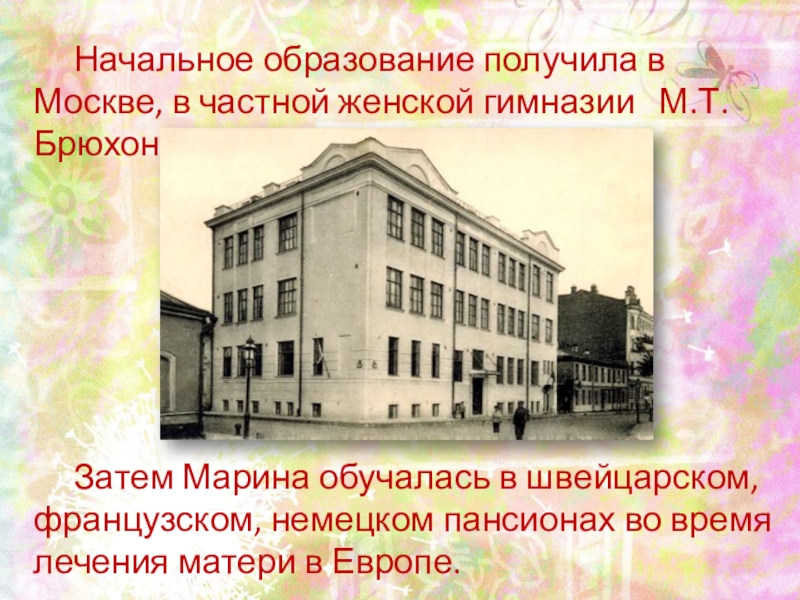 Затем Марина обучалась в швейцарском, французском, немецком пансионах во время лечения матери в Европе.