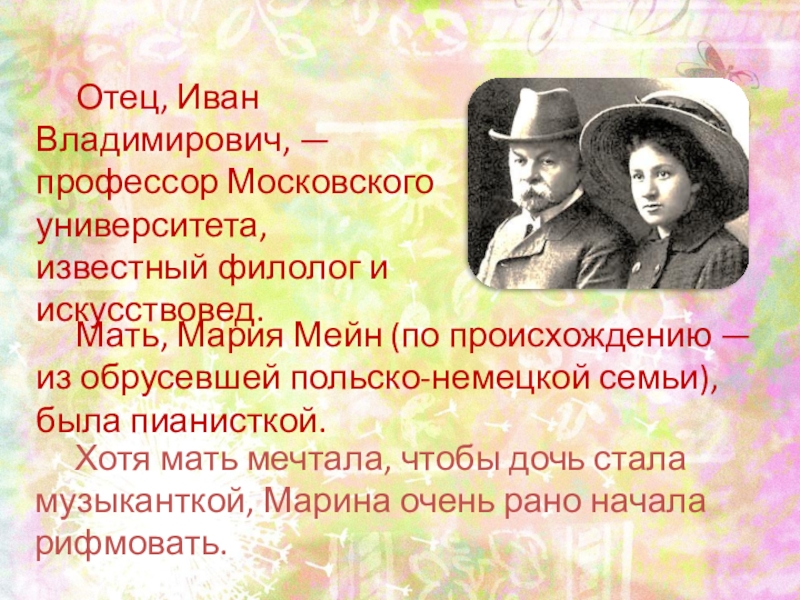 Мать, Мария Мейн (по происхождению — из обрусевшей польско-немецкой семьи), была пианисткой.