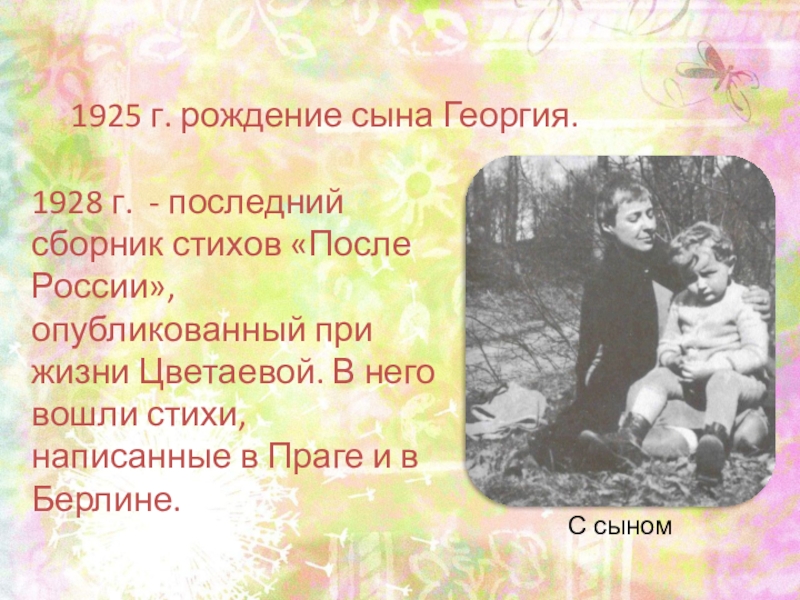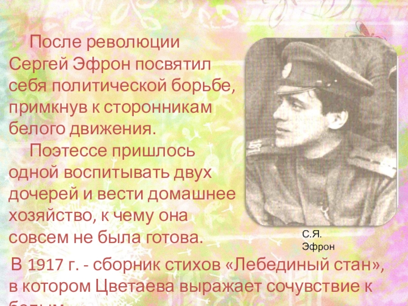 В 1917 г. - сборник стихов «Лебединый стан», в котором Цветаева выражает сочувствие к белым.