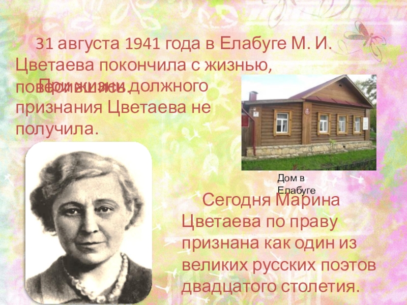 Сегодня Марина Цветаева по праву признана как один из великих русских поэтов двадцатого столетия.