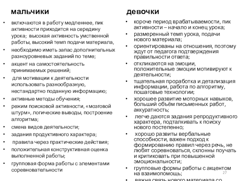хорошее развитие моторных навыков, больший объём письменных работ, аккуратность;