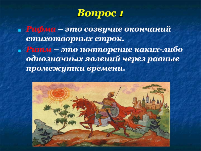 Вопрос 1Рифма – это созвучие окончаний стихотворных строк.Ритм – это повторение каких-либо однозначных явлений через равные промежутки времени.