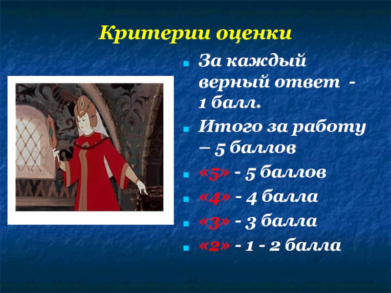 Критерии оценкиЗа каждый верный ответ -  1 балл. Итого за работу – 5 баллов«5» - 5