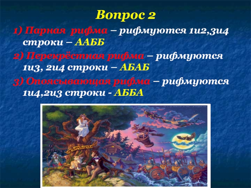 Вопрос 21) Парная рифма – рифмуются 1и2,3и4 строки – ААББ2) Перекрёстная рифма – рифмуются 1и3, 2и4 строки