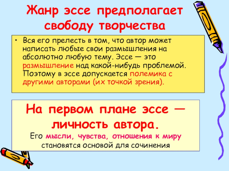автор может написать любые свои размышления на абсолютно любую тему. Эссе — это размышление над какой-нибудь проблемой. Поэтому в эссе допускается полемика с другими авторами (их точкой зрения).