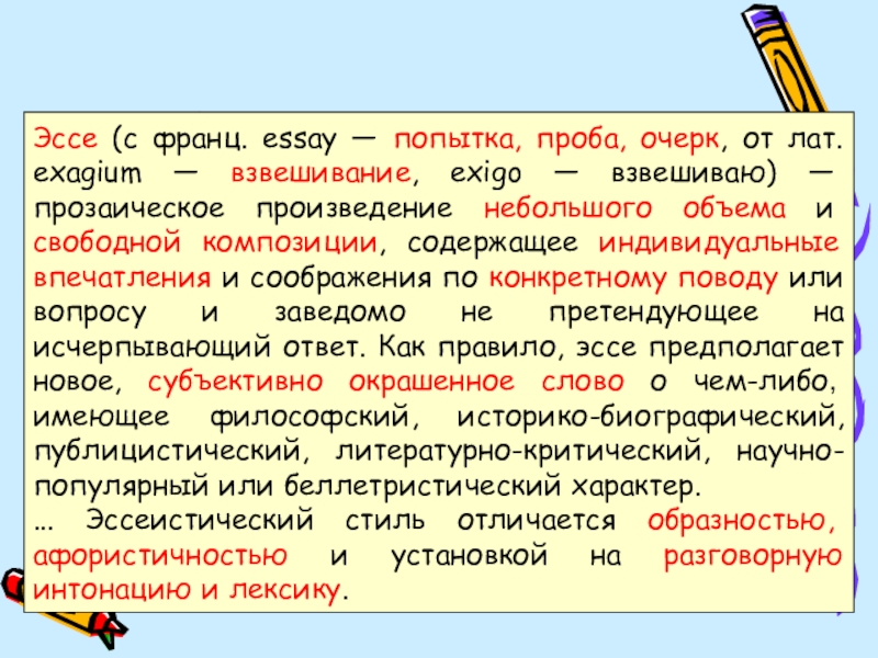 ... Эссеистический стиль отличается образностью, афористичностью и установкой на разговорную интонацию и лексику.