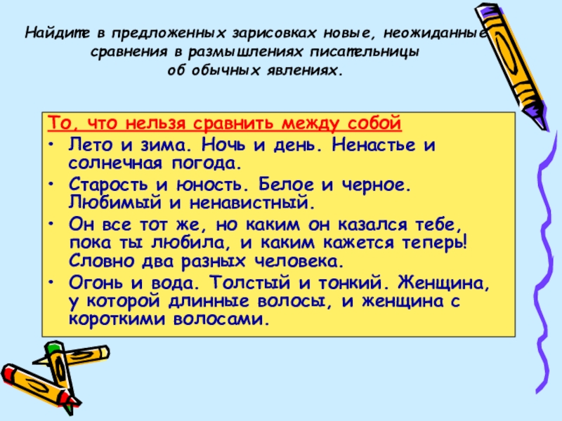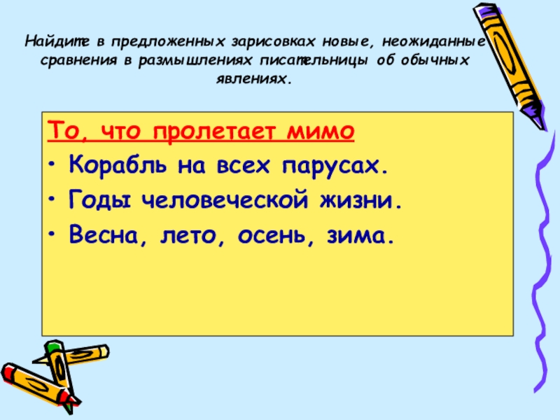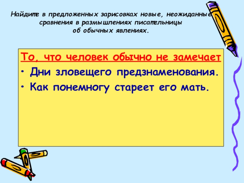 Слайд 15Найдите в предложенных зарисовках новые, неожиданные сравнения в размышлениях писательницы