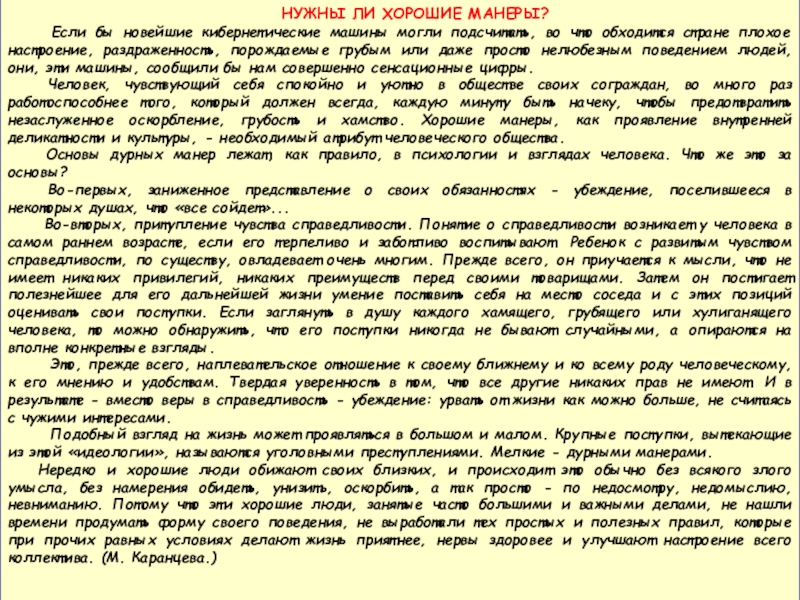 Человек, чувствующий себя спокойно и уютно в обществе своих сограждан, во много раз работоспособнее того, который должен всегда, каждую минуту быть начеку, чтобы предотвратить незаслуженное оскорбление, грубость и хамство. Хорошие манеры, как проявление внутренней деликатности и культуры, - необходимый атрибут человеческого общества.