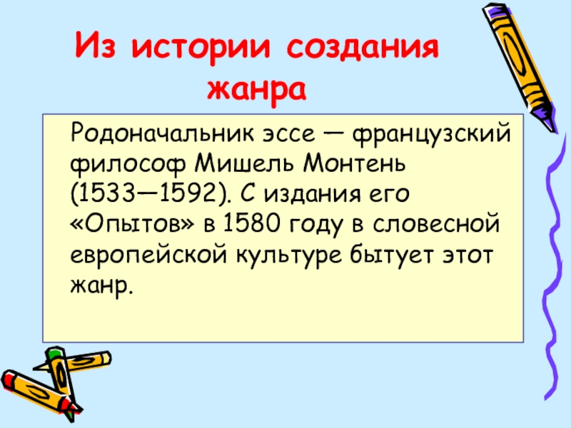 Мишель Монтень (1533—1592). С издания его «Опытов» в 1580 году в словесной европейской культуре бытует этот жанр.
