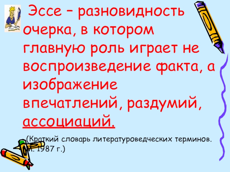 Слайд 19 Эссе – разновидность очерка, в котором главную роль играет