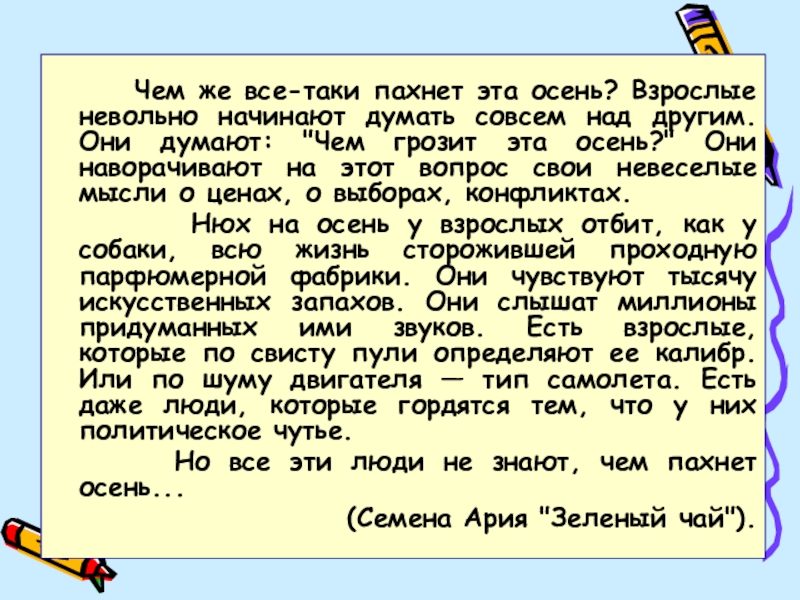 пахнет эта осень? Взрослые невольно начинают думать совсем над другим. Они думают: "Чем грозит эта осень?" Они наворачивают на этот вопрос свои невеселые мысли о ценах, о выборах, конфликтах.