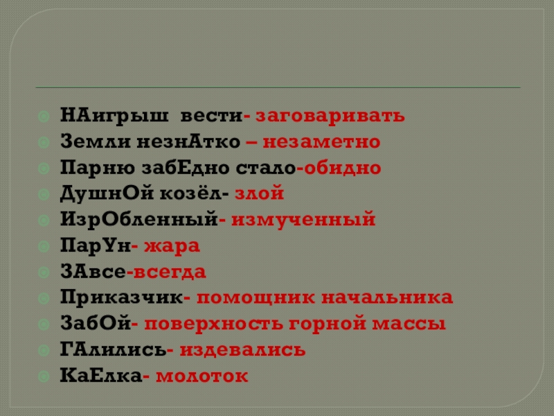 НАигрыш вести- заговариватьЗемли незнАтко – незаметноПарню забЕдно стало-обидноДушнОй козёл- злойИзрОбленный- измученныйПарУн- жара ЗАвсе-всегдаПриказчик- помощник начальникаЗабОй- поверхность горной