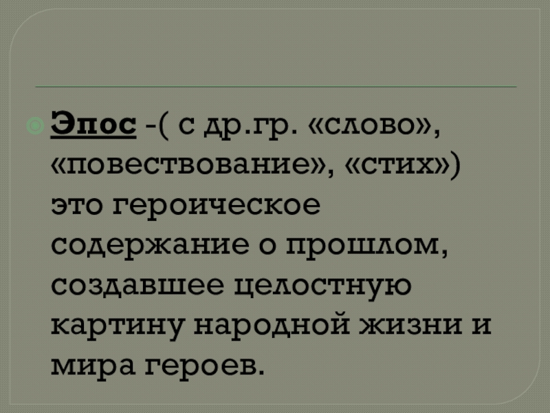 Эпос -( с др.гр. «слово», «повествование», «стих») это героическое содержание о прошлом, создавшее целостную картину народной жизни