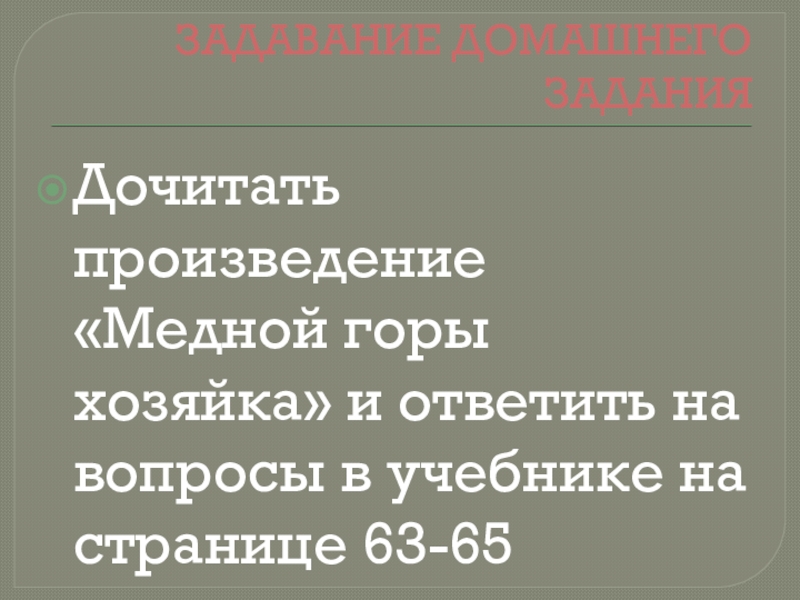 ЗАДАВАНИЕ ДОМАШНЕГО ЗАДАНИЯДочитать произведение «Медной горы хозяйка» и ответить на вопросы в учебнике на странице 63-65
