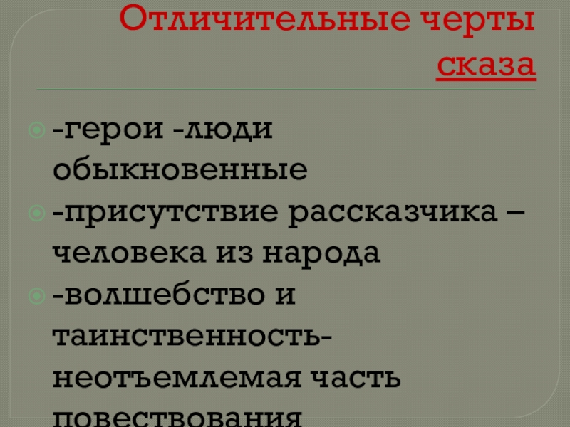 Отличительные черты сказа-герои -люди обыкновенные -присутствие рассказчика –человека из народа-волшебство и таинственность- неотъемлемая часть повествования