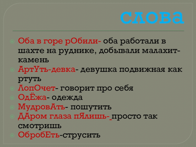 Разберем словаОба в горе рОбили- оба работали в шахте на руднике, добывали малахит-каменьАртУть-девка- девушка подвижная как ртутьЛопОчет-