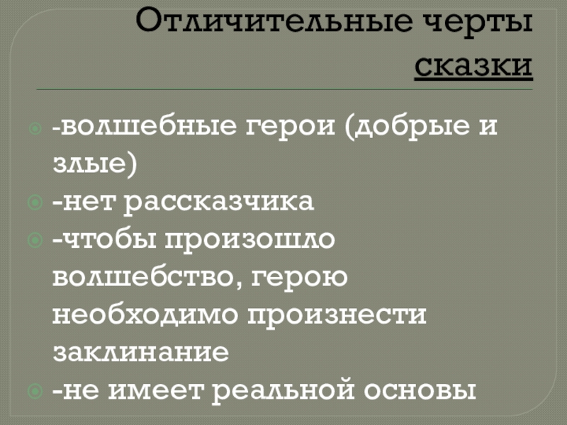 Отличительные черты сказки-волшебные герои (добрые и злые)-нет рассказчика-чтобы произошло волшебство, герою необходимо произнести заклинание-не имеет реальной основы