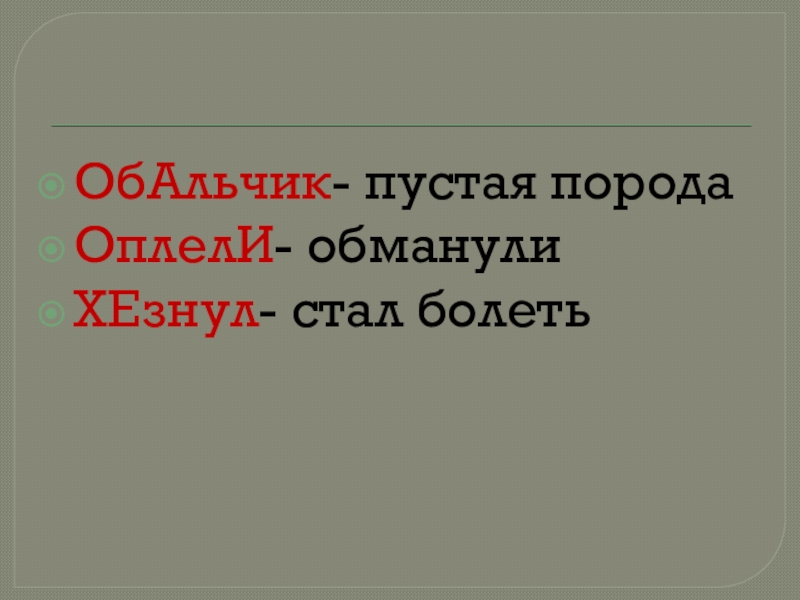 ОбАльчик- пустая породаОплелИ- обманулиХЕзнул- стал болеть