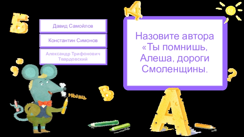 Константин СимоновДавид СамойловНазовите автора «Ты помнишь, Алеша, дороги Смоленщины.Александр Трифонович Твардовский