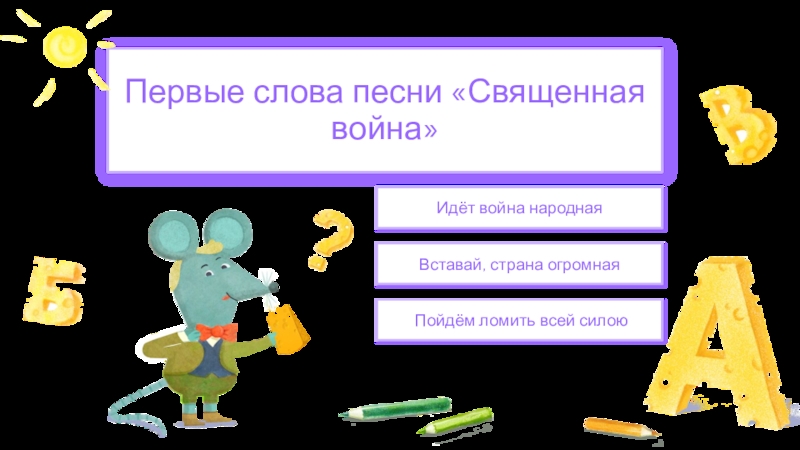 Вставай, страна огромнаяИдёт война народная Пойдём ломить всей силоюПервые слова песни «Священная война»
