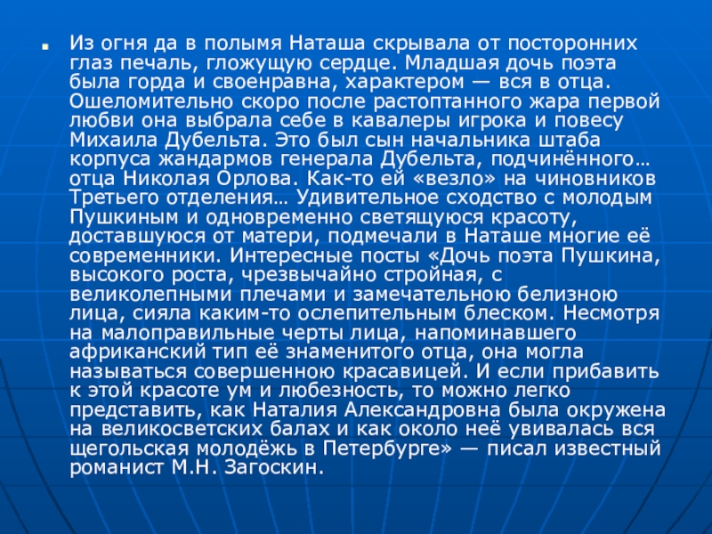гложущую сердце. Младшая дочь поэта была горда и своенравна, характером — вся в отца. Ошеломительно скоро после растоптанного жара первой любви она выбрала себе в кавалеры игрока и повесу Михаила Дубельта. Это был сын начальника штаба корпуса жандармов генерала Дубельта, подчинённого… отца Николая Орлова. Как-то ей «везло» на чиновников Третьего отделения… Удивительное сходство с молодым Пушкиным и одновременно светящуюся красоту, доставшуюся от матери, подмечали в Наташе многие её современники. Интересные посты «Дочь поэта Пушкина, высокого роста, чрезвычайно стройная, с великолепными плечами и замечательною белизною лица, сияла каким-то ослепительным блеском. Несмотря на малоправильные черты лица, напоминавшего африканский тип её знаменитого отца, она могла называться совершенною красавицей. И если прибавить к этой красоте ум и любезность, то можно легко представить, как Наталия Александровна была окружена на великосветских балах и как около неё увивалась вся щегольская молодёжь в Петербурге» — писал известный романист М.Н. Загоскин.