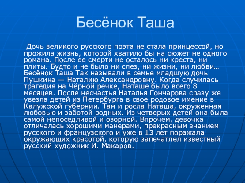 но прожила жизнь, которой хватило бы на сюжет не одного романа. После ее смерти не осталось ни креста, ни плиты. Будто и не было ни слез, ни жизни, ни любви… Бесёнок Таша Так называли в семье младшую дочь Пушкина — Наталию Александровну. Когда случилась трагедия на Чёрной речке, Наташе было всего 8 месяцев. После несчастья Наталья Гончарова сразу же увезла детей из Петербурга в свое родовое имение в Калужской губернии. Там и росла Наташа, окруженная любовью и заботой родных. Из четверых детей она была самой непоседливой и озорной. Впрочем, девочка отличалась хорошими манерами, прекрасным знанием русского и французского и уже в 13 лет поражала окружающих красотой, которую запечатлел известный русский художник И. Макаров.