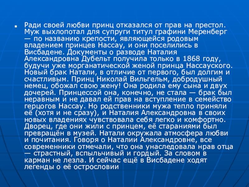для супруги титул графини Меренберг — по названию крепости, являющейся родовым владением принцев Нассау, и они поселились в Висбадене. Документы о разводе Наталия Александровна Дубельт получила только в 1868 году, будучи уже морганатической женой принца Нассауского. Новый брак Натали, в отличие от первого, был долгим и счастливым. Принц Николай Вильгельм, добродушный немец, обожал свою жену! Она родила ему сына и двух дочерей. Принцессой она, конечно, не стала — брак был неравным и не давал ей прав на вступление в семейство герцогов Нассау. Но родственники мужа тепло приняли её (хотя и не сразу), и Наталия Александровна в своих новых владениях чувствовала себя легко и комфортно. Дворец, где они жили с принцем, её стараниями был превращён в музей. Натали окружала атмосфера любви и почитания. Говоря о Наталии Александровне, все современники отмечали, что она унаследовала нрав отца — страстный, вспыльчивый и гордый. За словом в карман не лезла. И сейчас ещё в Висбадене ходят легенды о её острословии