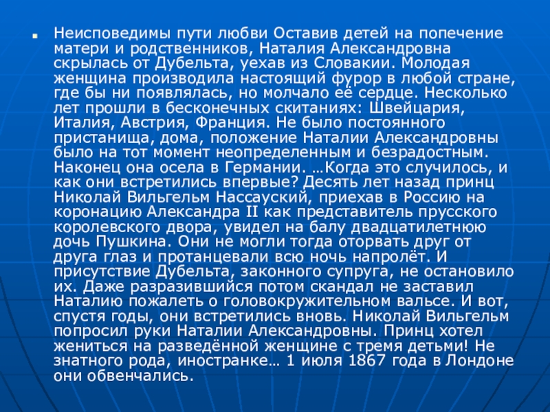 Александровна скрылась от Дубельта, уехав из Словакии. Молодая женщина производила настоящий фурор в любой стране, где бы ни появлялась, но молчало её сердце. Несколько лет прошли в бесконечных скитаниях: Швейцария, Италия, Австрия, Франция. Не было постоянного пристанища, дома, положение Наталии Александровны было на тот момент неопределенным и безрадостным. Наконец она осела в Германии. …Когда это случилось, и как они встретились впервые? Десять лет назад принц Николай Вильгельм Нассауский, приехав в Россию на коронацию Александра II как представитель прусского королевского двора, увидел на балу двадцатилетнюю дочь Пушкина. Они не могли тогда оторвать друг от друга глаз и протанцевали всю ночь напролёт. И присутствие Дубельта, законного супруга, не остановило их. Даже разразившийся потом скандал не заставил Наталию пожалеть о головокружительном вальсе. И вот, спустя годы, они встретились вновь. Николай Вильгельм попросил руки Наталии Александровны. Принц хотел жениться на разведённой женщине с тремя детьми! Не знатного рода, иностранке… 1 июля 1867 года в Лондоне они обвенчались.