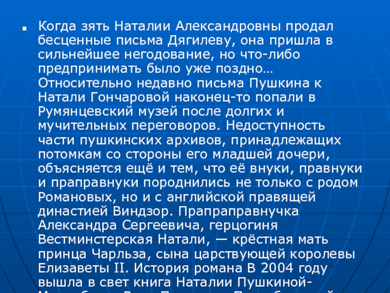 сильнейшее негодование, но что-либо предпринимать было уже поздно… Относительно недавно письма Пушкина к Натали Гончаровой наконец-то попали в Румянцевский музей после долгих и мучительных переговоров. Недоступность части пушкинских архивов, принадлежащих потомкам со стороны его младшей дочери, объясняется ещё и тем, что её внуки, правнуки и праправнуки породнились не только с родом Романовых, но и с английской правящей династией Виндзор. Прапраправнучка Александра Сергеевича, герцогиня Вестминстерская Натали, — крёстная мать принца Чарльза, сына царствующей королевы Елизаветы II. История романа В 2004 году вышла в свет книга Наталии Пушкиной-Меренберг «Вера Петровна. Петербургский роман».