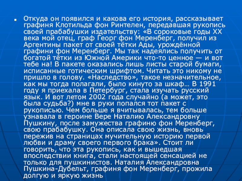 Ринтелен, передавшая рукопись своей прабабушки издательству: «В сороковые годы XX века мой отец, граф Георг фон Меренберг, получил из Аргентины пакет от своей тётки Ады, урождённой графини фон Меренберг. Мы так надеялись получить от богатой тётки из Южной Америки что-то ценное — и вот тебе на! В пакете оказались лишь листы старой бумаги, исписанные готическим шрифтом. Читать это никому не пришло в голову. «Наследство», такое незначительное, как мы тогда полагали, было кинуто за шкаф… В 1991 году я приехала в Петербург, стала изучать русский язык. И вот летом 2002 года случайно (а может, это была судьба?) мне в руки попался тот пакет с рукописью. Чем больше я вчитывалась, тем больше узнавала в героине Вере Наталию Александровну Пушкину, после замужества графиню фон Меренберг, свою прабабушку. Она описала свою жизнь, вновь пережив на страницах мучительную историю первой любви и драму своего первого брака». Стоит ли говорить, что эта рукопись, как и вышедшая впоследствии книга, стали настоящей сенсацией не только для пушкинистов. Наталия Александровна Пушкина-Дубельт, графиня фон Меренберг, прожила долгую и яркую жизнь
