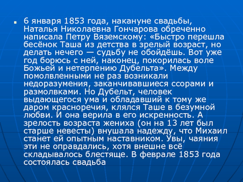 6 января 1853 года, накануне свадьбы, Наталья Николаевна Гончарова обреченно написала