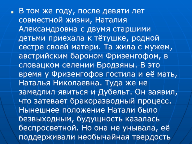 с двумя старшими детьми приехала к тётушке, родной сестре своей матери. Та жила с мужем, австрийским бароном Фризенгофом, в словацком селении Бродзяны. В это время у Фризенгофов гостила и её мать, Наталья Николаевна. Туда же не замедлил явиться и Дубельт. Он заявил, что затевает бракоразводный процесс. Нынешнее положение Натали было безвыходным, будущность казалась беспросветной. Но она не унывала, её поддерживали необычайная твердость духа и сила воли