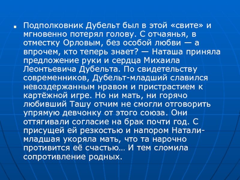отчаянья, в отместку Орловым, без особой любви — а впрочем, кто теперь знает? — Наташа приняла предложение руки и сердца Михаила Леонтьевича Дубельта. По свидетельству современников, Дубельт-младший славился невоздержанным нравом и пристрастием к картёжной игре. Но ни мать, ни горячо любивший Ташу отчим не смогли отговорить упрямую девчонку от этого союза. Они оттягивали согласие на брак почти год. С присущей ей резкостью и напором Натали-младшая укоряла мать, что та нарочно противится её счастью… И тем сломила сопротивление родных.