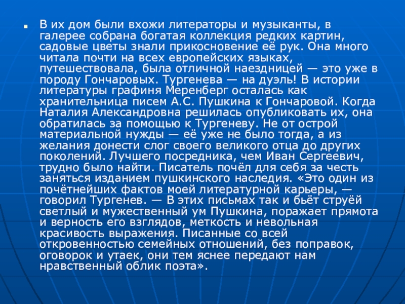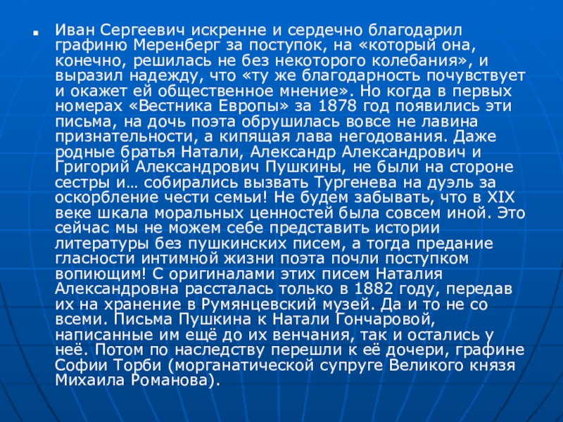богатая коллекция редких картин, садовые цветы знали прикосновение её рук. Она много читала почти на всех европейских языках, путешествовала, была отличной наездницей — это уже в породу Гончаровых. Тургенева — на дуэль! В истории литературы графиня Меренберг осталась как хранительница писем А.С. Пушкина к Гончаровой. Когда Наталия Александровна решилась опубликовать их, она обратилась за помощью к Тургеневу. Не от острой материальной нужды — её уже не было тогда, а из желания донести слог своего великого отца до других поколений. Лучшего посредника, чем Иван Сергеевич, трудно было найти. Писатель почёл для себя за честь заняться изданием пушкинского наследия. «Это один из почётнейших фактов моей литературной карьеры, — говорил Тургенев. — В этих письмах так и бьёт струёй светлый и мужественный ум Пушкина, поражает прямота и верность его взглядов, меткость и невольная красивость выражения. Писанные со всей откровенностью семейных отношений, без поправок, оговорок и утаек, они тем яснее передают нам нравственный облик поэта».