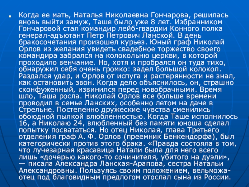было уже 8 лет. Избранником Гончаровой стал командир лейб-гвардии Конного полка генерал-адъютант Петр Петрович Ланской. В день бракосочетания произошел курьез. Юный граф Николай Орлов из желания увидеть свадебное торжество своего командира забрался на колокольню церкви, в которой проходило венчание. Но, хотя и пробрался он туда тихо, обнаружил себя очень громко: задел большой колокол. Раздался удар, и Орлов от испуга и растерянности не знал, как остановить звон. Когда дело объяснилось, он, страшно сконфуженный, извинился перед новобрачными. Время шло, Таша росла. Николай Орлов все больше времени проводил в семье Ланских, особенно летом на даче в Стрельне. Постепенно дружеские чувства сменились обоюдной пылкой влюбленностью. Когда Таше исполнилось 16, а Николаю 24, влюбленный без памяти юноша сделал попытку посвататься. Но отец Николая, глава Третьего отделения граф А. Ф. Орлов (преемник Бенкендорфа), был категорически против этого брака. «Правда состояла в том, что лучезарная красавица Натали была для него всего лишь «дочерью какого-то сочинителя, убитого на дуэли», — писала Александра Ланская-Арапова, сестра Натальи Александровны. Пользуясь своим положением, вельможа-отец под благовидным предлогом отослал сына из России.