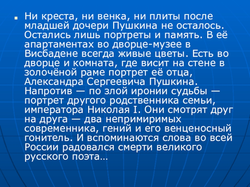 осталось. Остались лишь портреты и память. В её апартаментах во дворце-музее в Висбадене всегда живые цветы. Есть во дворце и комната, где висит на стене в золочёной раме портрет её отца, Александра Сергеевича Пушкина. Напротив — по злой иронии судьбы — портрет другого родственника семьи, императора Николая I. Они смотрят друг на друга — два непримиримых современника, гений и его венценосный гонитель. И вспоминаются слова во всей России радовался смерти великого русского поэта…