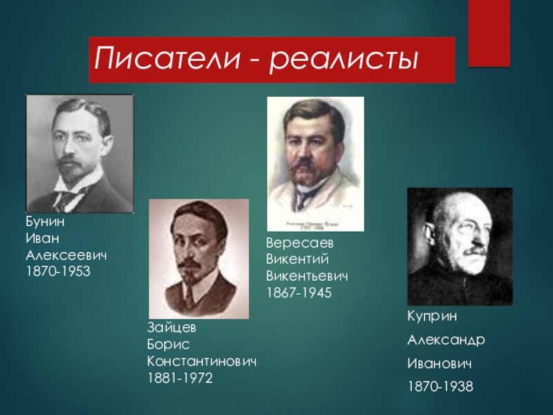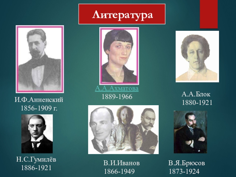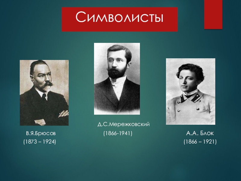 Представители: В. Брюсов, К. Бальмонт, Ф. Сологуб, Д. Мережковский; А. Блок, А. Белый, Вяч. Иванов, С. Соловьев