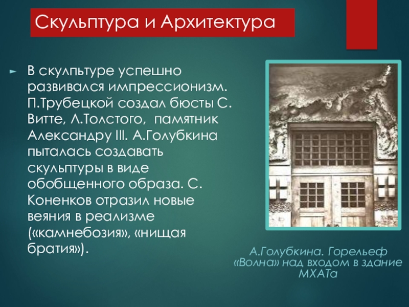 скулпьтуре успешно развивался импрессионизм. П.Трубецкой создал бюсты С.Витте, Л.Толстого, памятник Александру III. А.Голубкина пыталась создавать скульптуры в виде обобщенного образа. С.Коненков отразил новые веяния в реализме(«камнебозия», «нищая братия»).