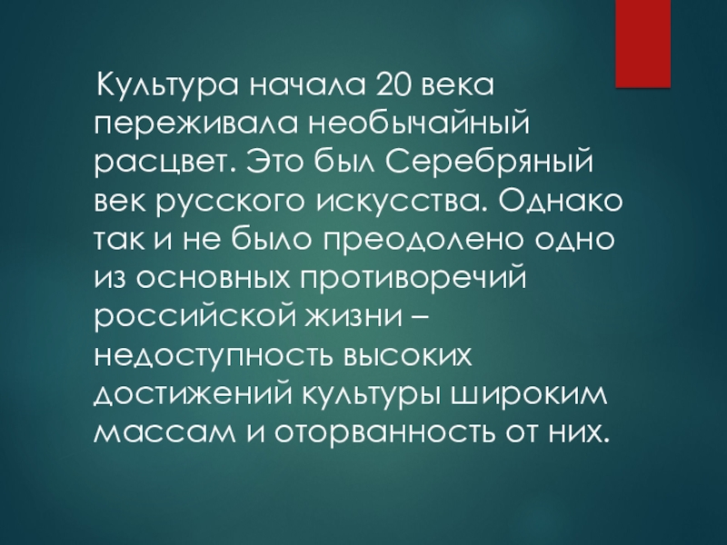 Серебряный век русского искусства. Однако так и не было преодолено одно из основных противоречий российской жизни – недоступность высоких достижений культуры широким массам и оторванность от них.
