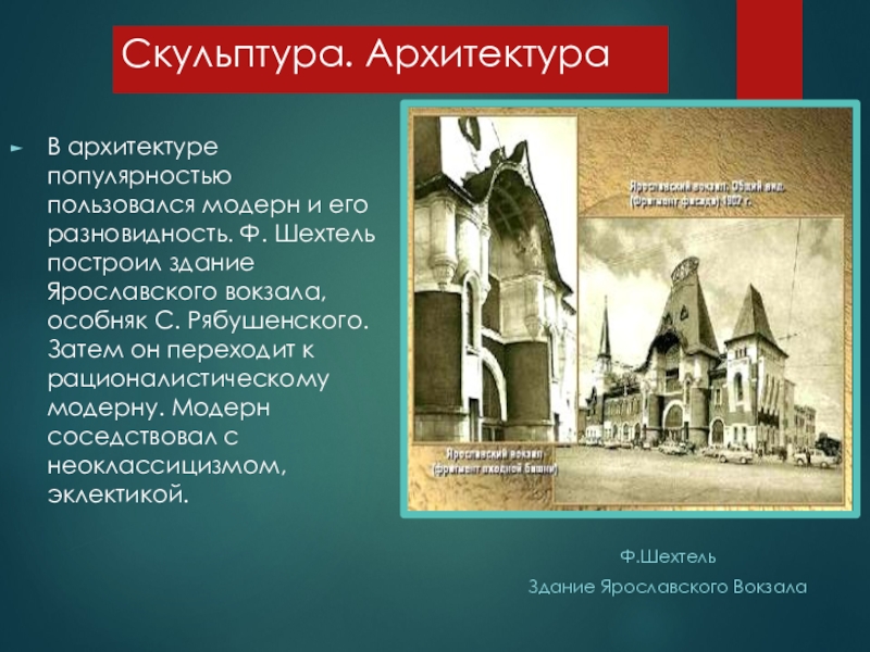 его разновидность. Ф. Шехтель построил здание Ярославского вокзала, особняк С. Рябушенского. Затем он переходит к рационалистическому модерну. Модерн соседствовал с неоклассицизмом, эклектикой.