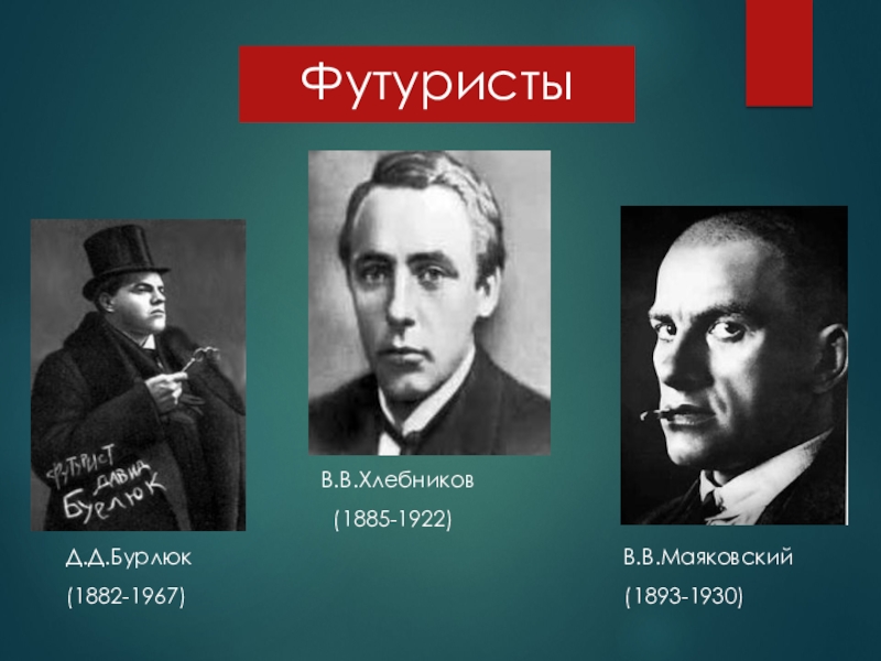 Представители: Д. Д. Бурлюк, В. В. Маяковский, В. Хлебников и др