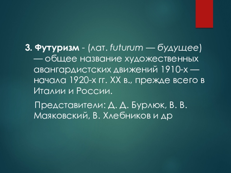 Слайд 173. Футуризм - (лат. futurum — будущее) — общее название художественных авангардистских