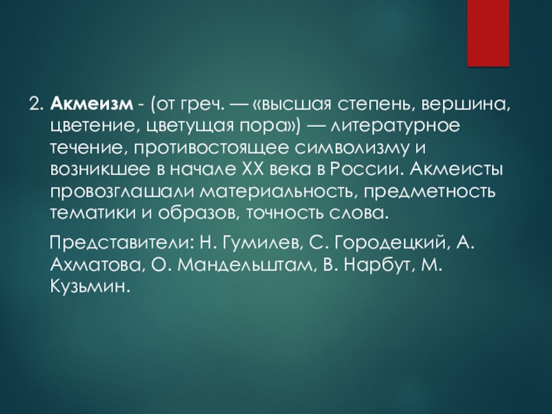 Слайд 162. Акмеизм - (от греч. — «высшая степень, вершина, цветение, цветущая